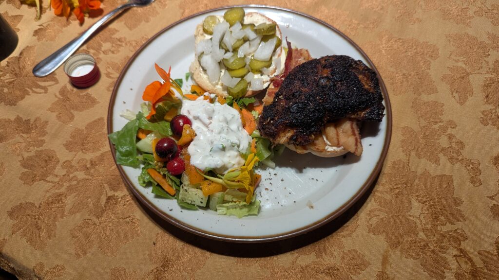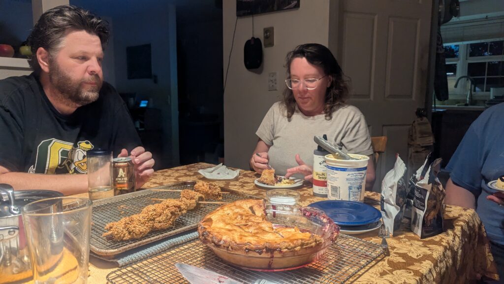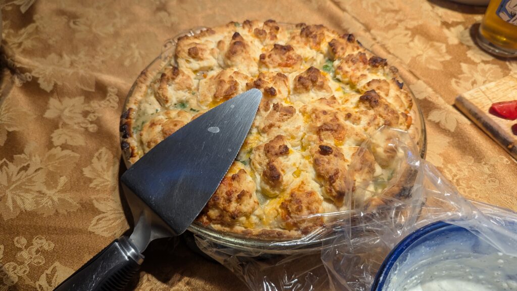 Chicken Pot Pie. (Bottom crust partially baked from America’s Test Kitchen Family Cookbook, filling from the same book, topping was from Pork and cabbage stew with cheddar dumplings (Cook’s Country Oct/Nov 2021)).