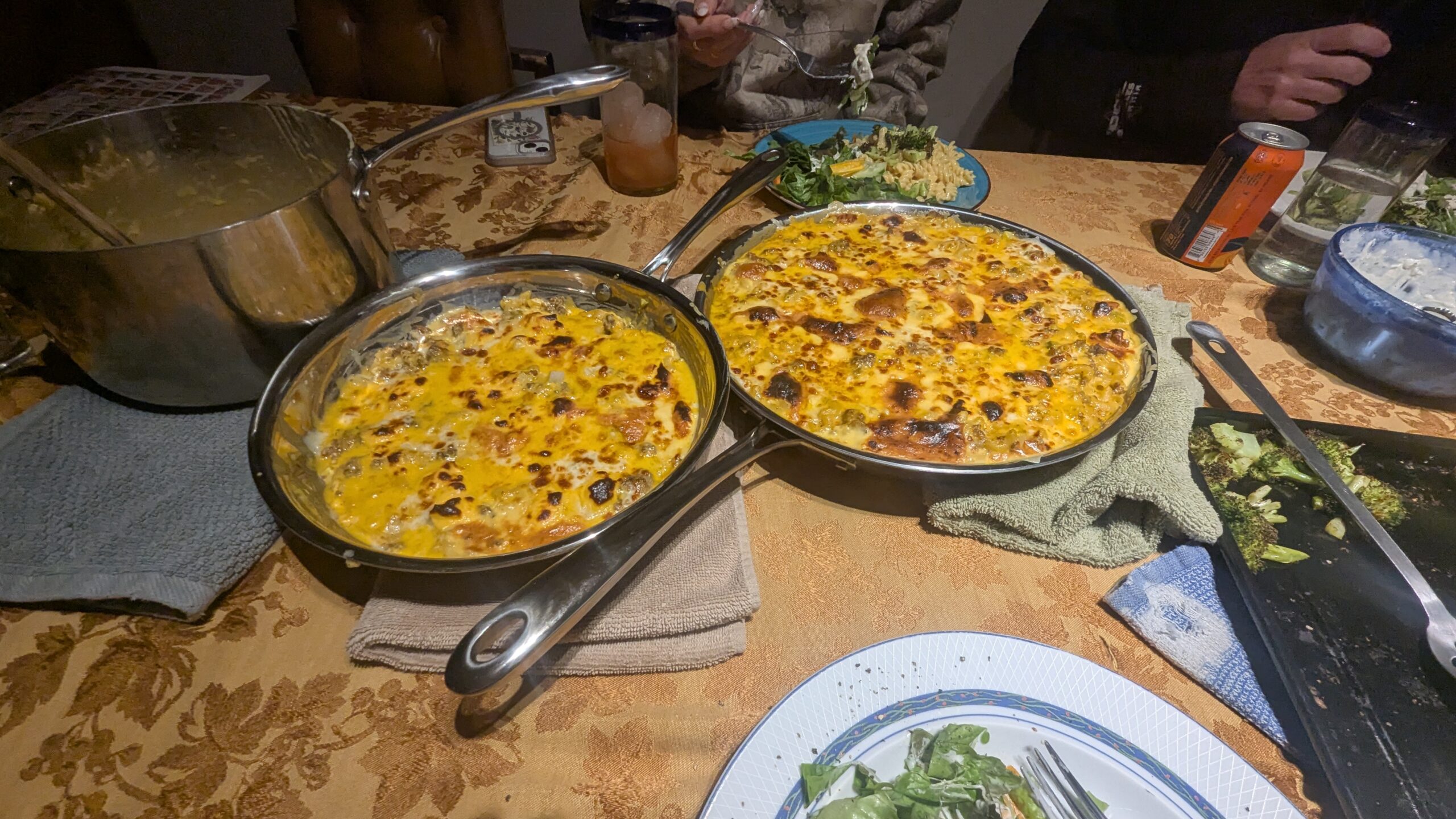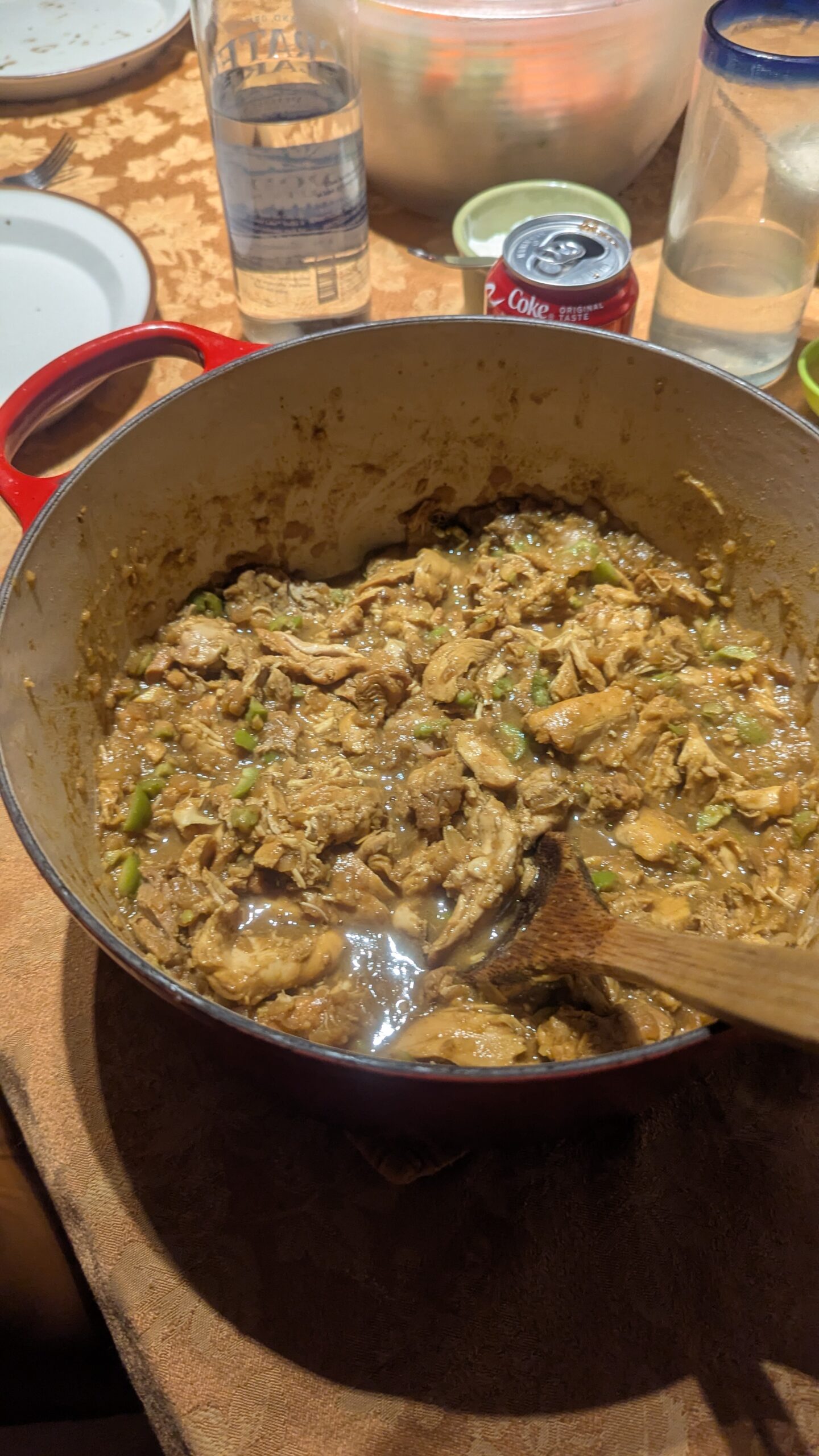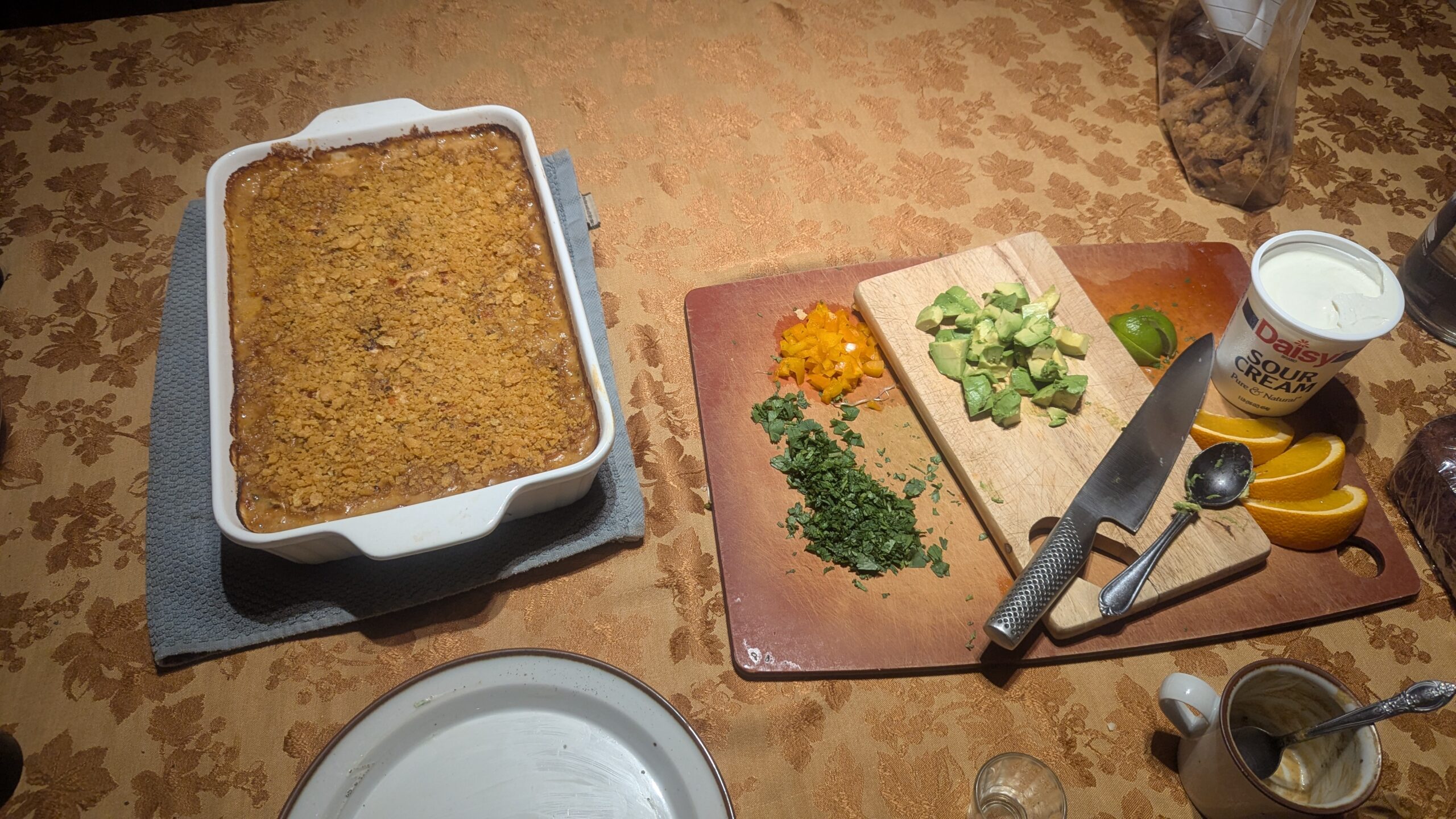 King Ranch Casserole made with homemade corn tortillas with twice the jalepeno (Cook’s Country, April/May 2007)