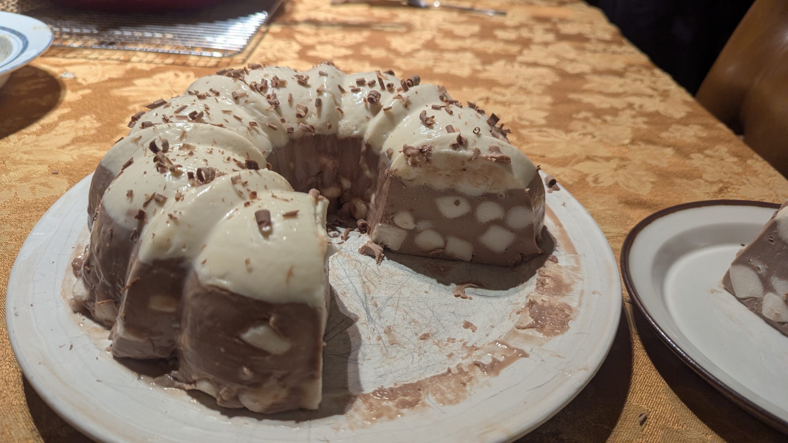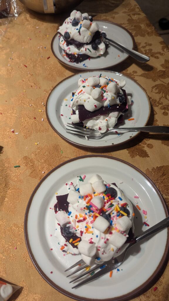 Hand picked blueberry jello with whipped cream and marshmallows.
