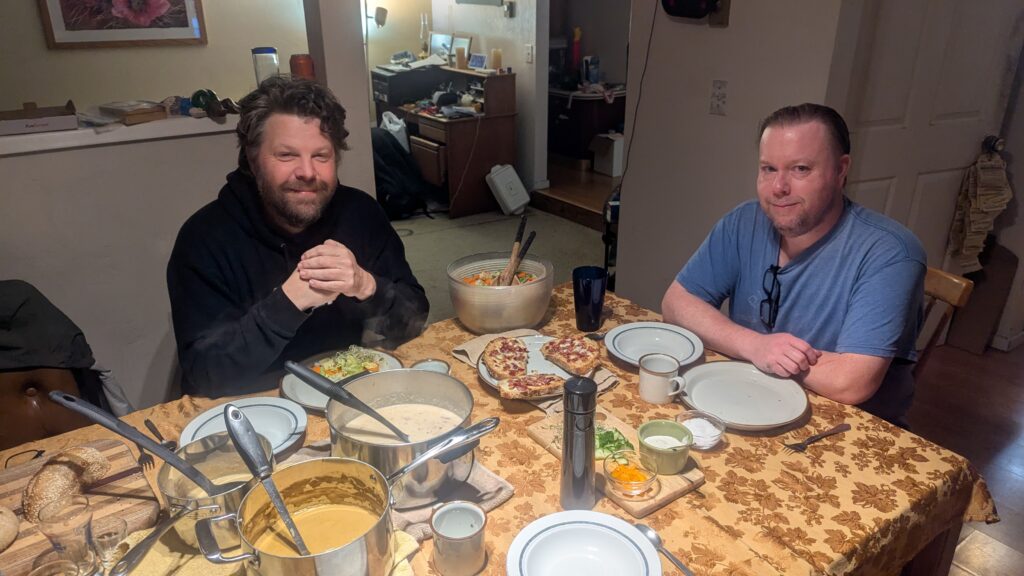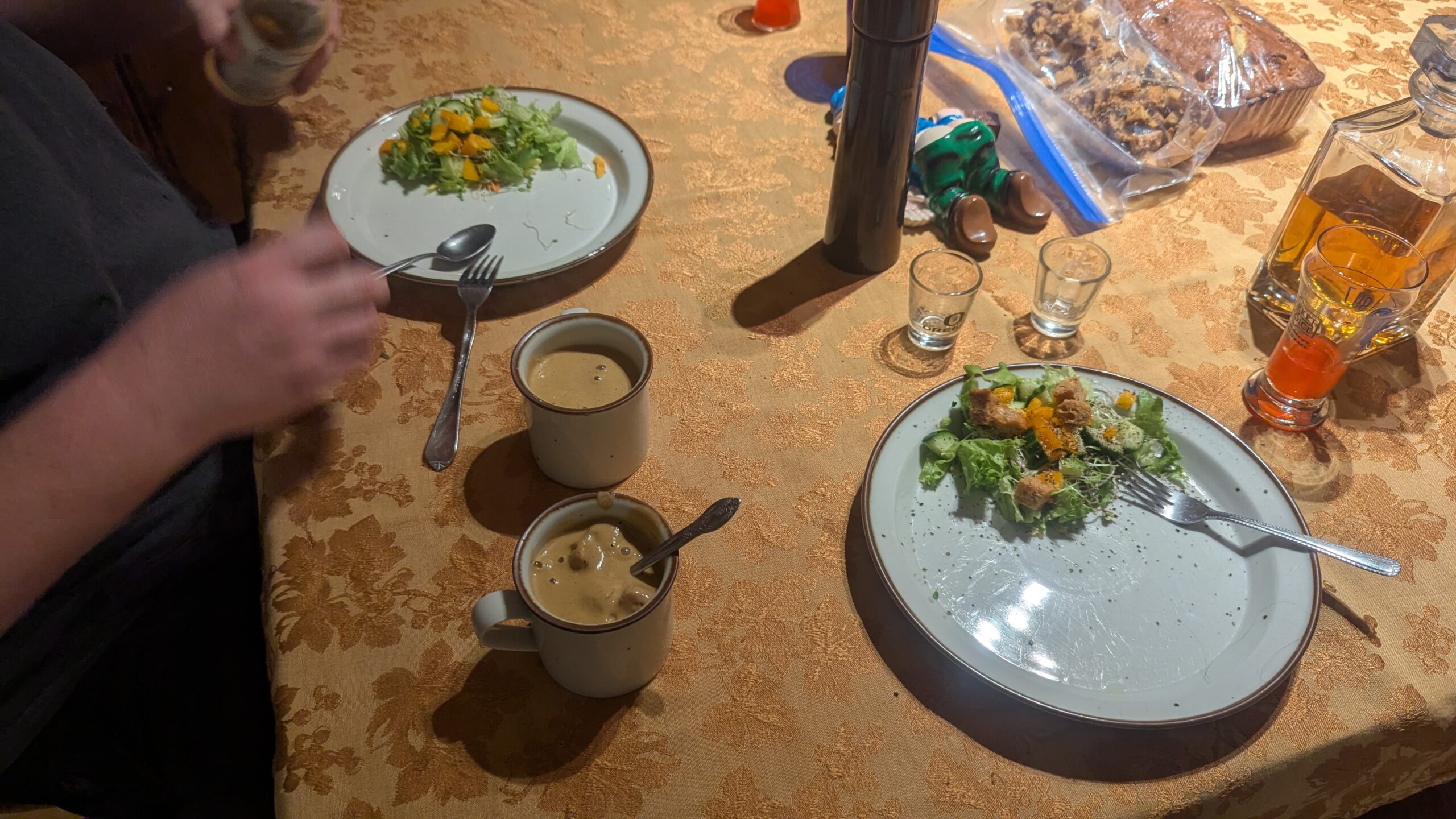 Wild mushroom soup (bacon, carrots, onion, celery, garlic, cauliflower mushroom, porcini, hedgehogs, and chaterelles)