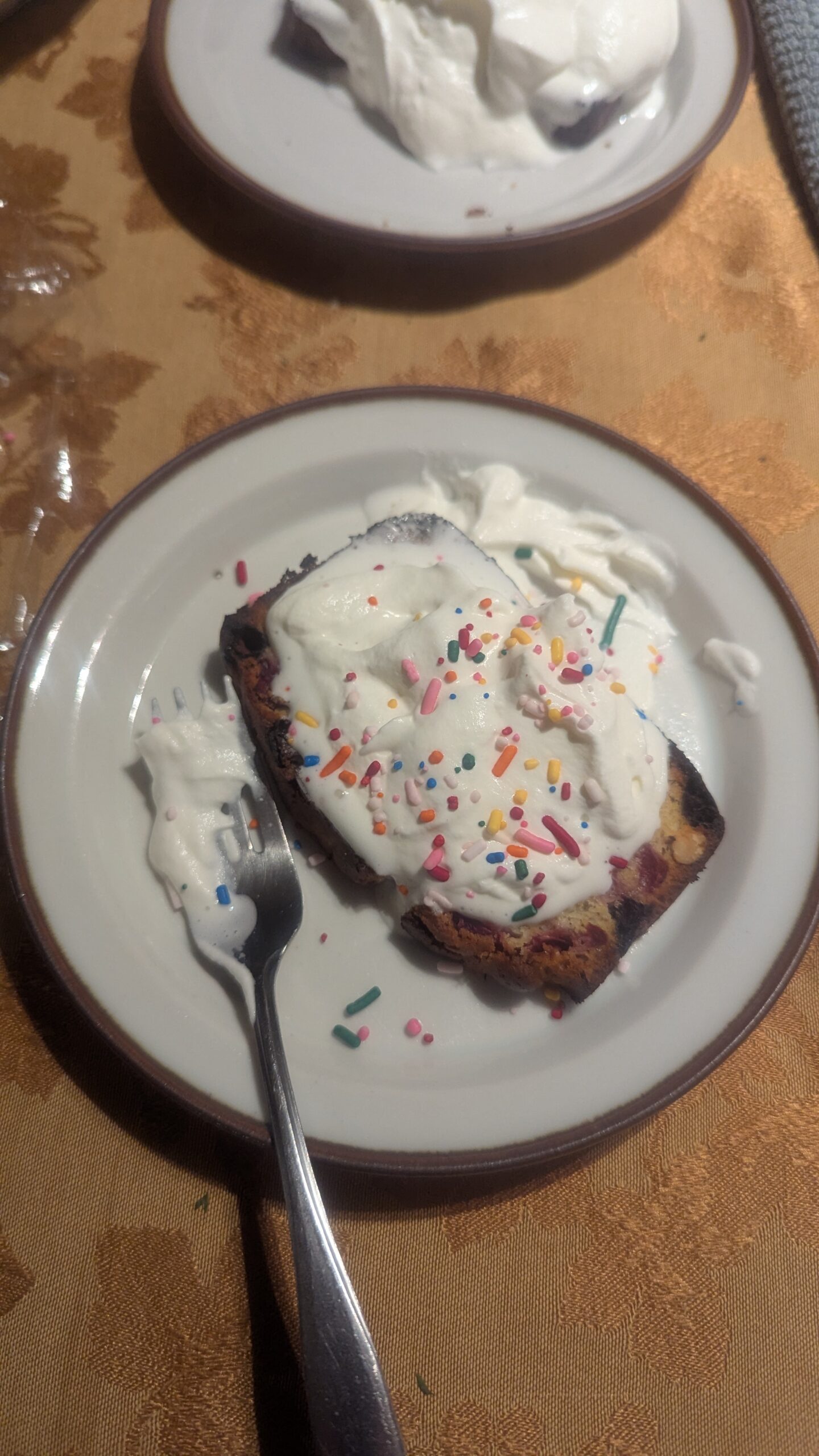 Cranberry-orange nut bread (Amercia’s Test Kitchen Family Cookbook) toasted with whipped cream