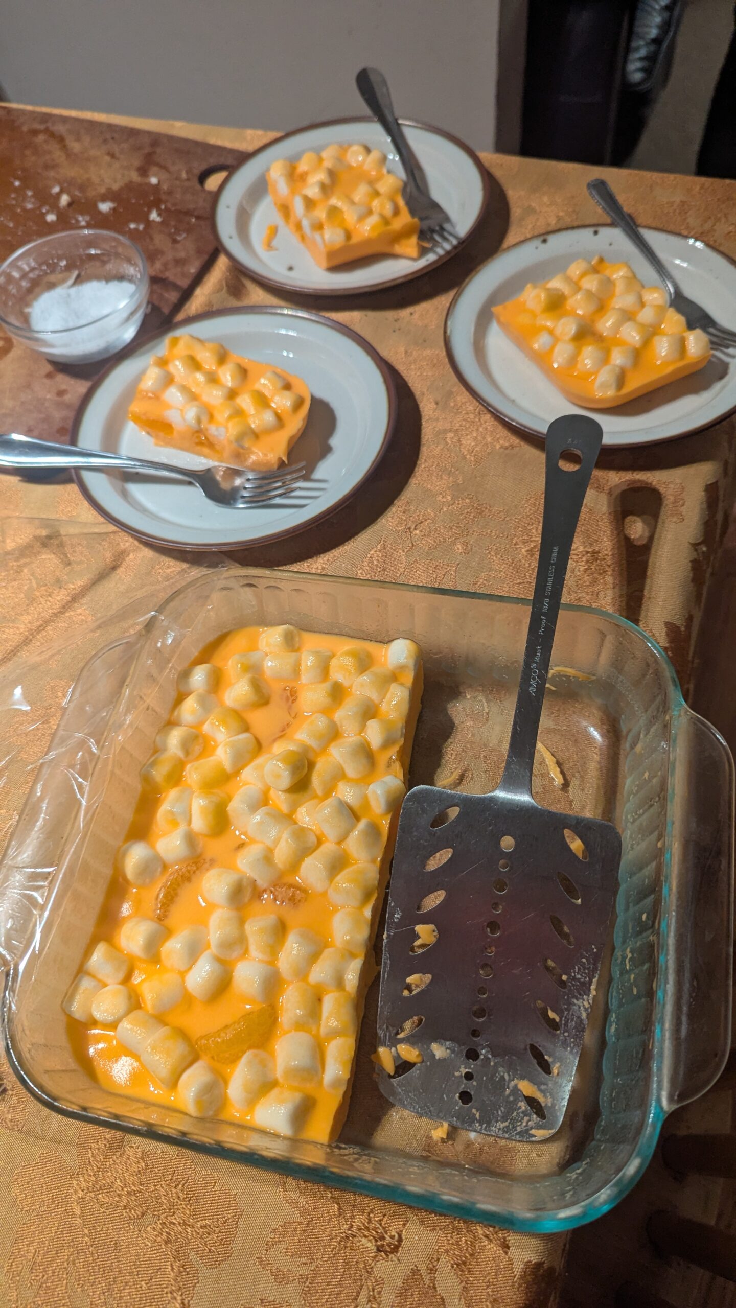 Fluffy orange creamcicle jello with mandarin oranges and mini marshmallows.